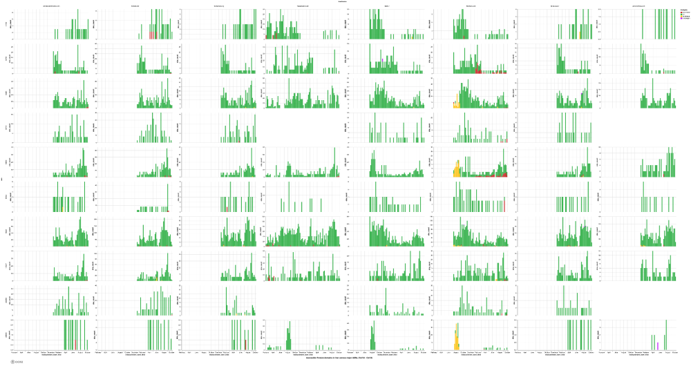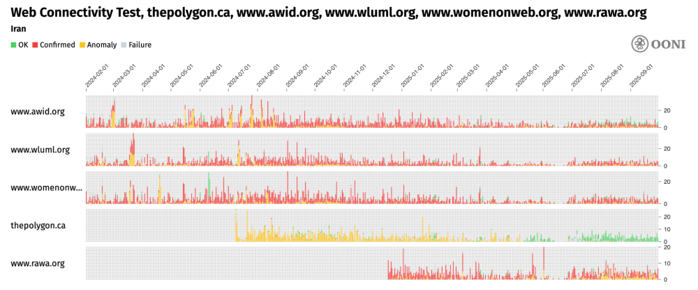 The following chart aggregates OONI measurement coverage from the testing of the blocked international women’s rights websites (listed in the above table) on multiple networks in Iran between 1st February 2024 to 1st October 2025.
