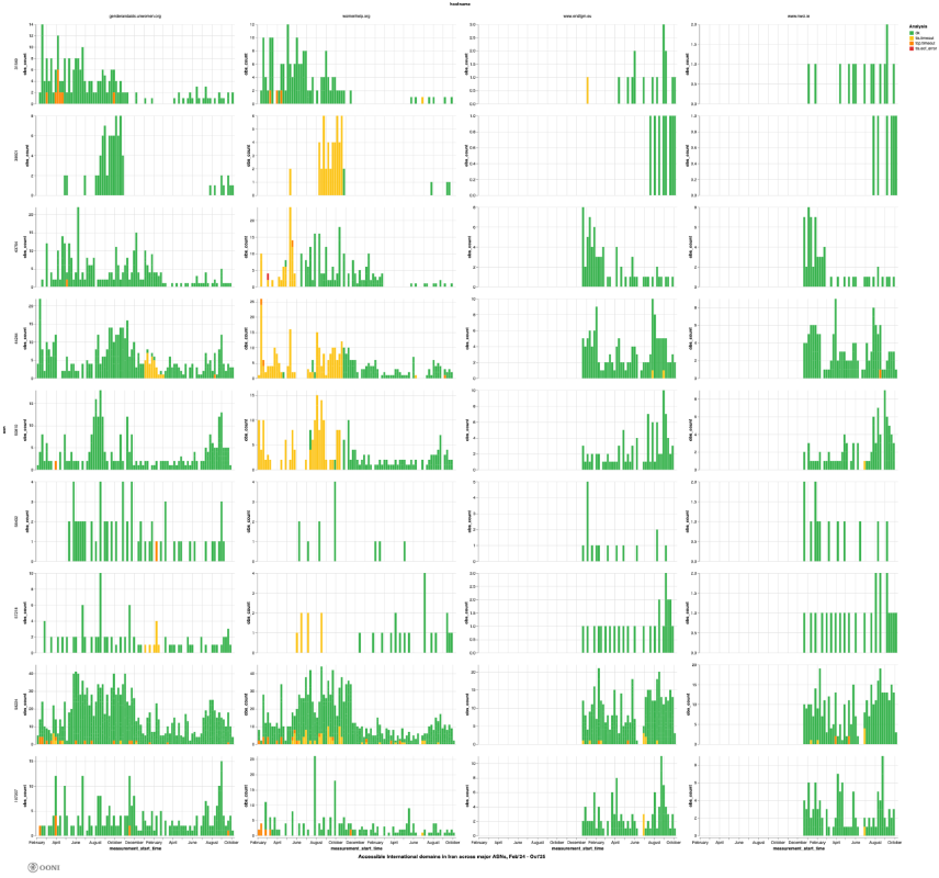 The above charts were produced using OONI Pipeline v5 and they aggregate OONI Probe measurement coverage for the 5 international women’s rights websites that presented signs of blocking on the ASes that received the largest measurement coverage in Iran between 1st February 2024 to 1st October 2025. These charts provide a breakdown of the analysis results, illustrating that while several different errors emerged in the testing, the majority of measurements (for 4 out of 5 domains) returned bogon IP addresses in the DNS answers on all major ASes during the analysis period. It is therefore evident that, similarly to the blocking of Persian women’s rights websites, DNS tampering is the primary censorship technique used by major ISPs in Iran to block access to international women’s rights websites.