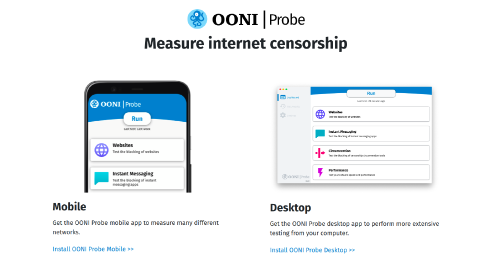 Free and open source tools for measuring internet censorship. Anyone can install OONI Probe (on both mobile and desktop platforms) to measure internet censorship on their network. To enable use, we tried to make OONI Probe as easy to use as possible, we included features based on community requests, and we worked with the Localization Lab community on its localization.