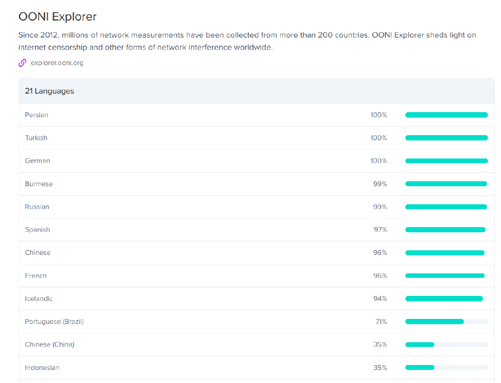 In 2022, OONI Explorer copy was uploaded to Transifex to enable its translation by the Localization Lab community, who worked towards translating the platform in 21 languages. OONI Explorer has already been translated to Farsi, Turkish, Russian, Burmese, Spanish, and Chinese, among other languages. To support translation efforts, we published new OONI Explorer localization guidelines.